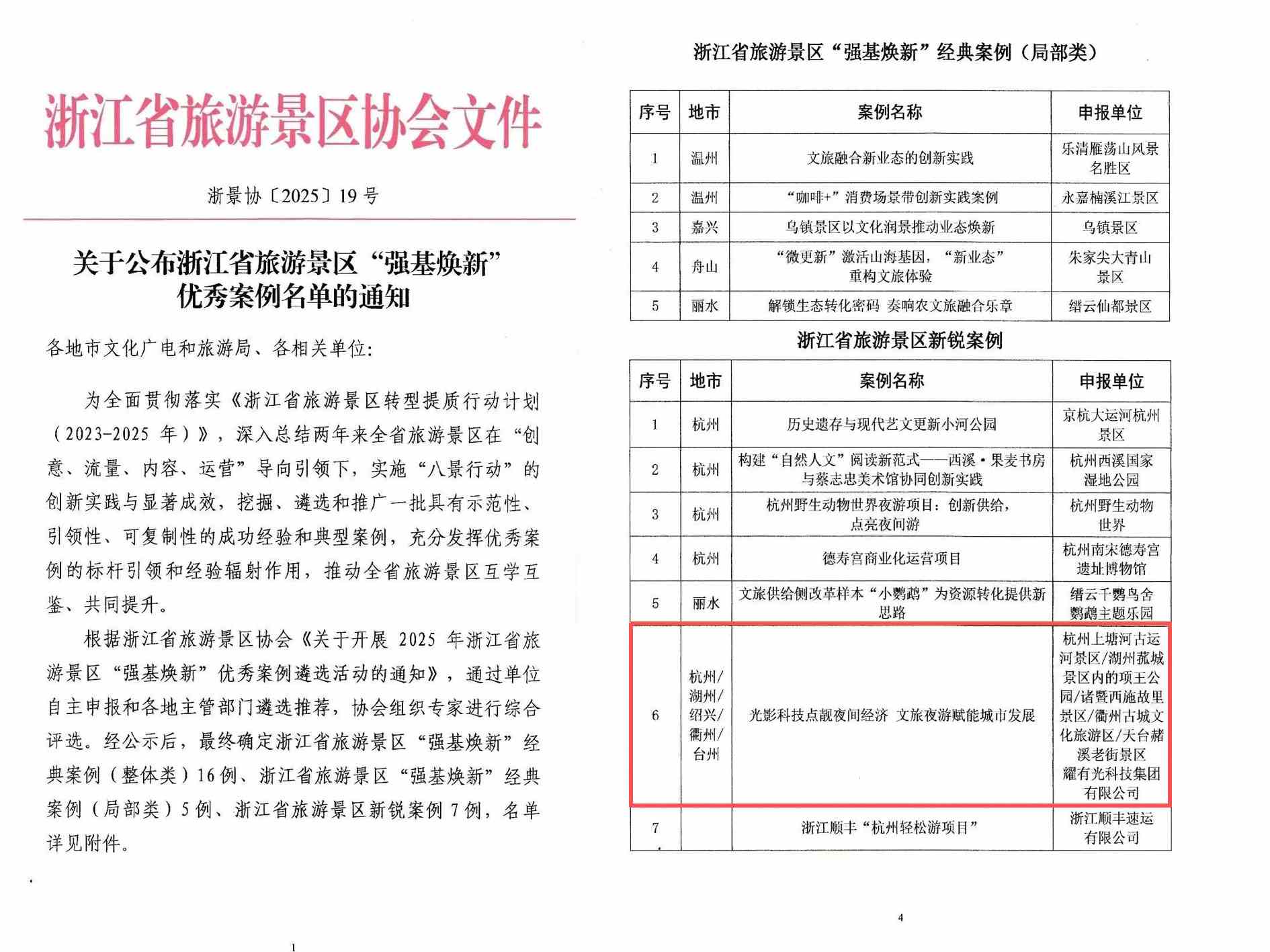 9月28日,浙江省文化旅游景区协会公布了浙江省旅游景区“强基焕新”优秀案例名单,其中耀有光倾力打造的杭州《如梦上塘》、湖州《青绿湖影》、诸暨《遇见西施》、台州《心归天台》、衢州《衢州奇妙夜》五大夜游项目实力入选,成为全省旅游景区互学互鉴、共同提升的标杆案例。