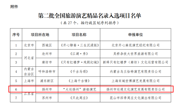 15日,文化和旅游部正式公布第二批全国旅游演艺精品名录,耀有光倾力打造的“大运扬州”古运河行进式游船演艺项目从全国150个参评项目中脱颖而出,以江苏省排名第一的成绩成功跻身此次27个国家级精品项目行列,为扬州文旅高质量发展再添助力。